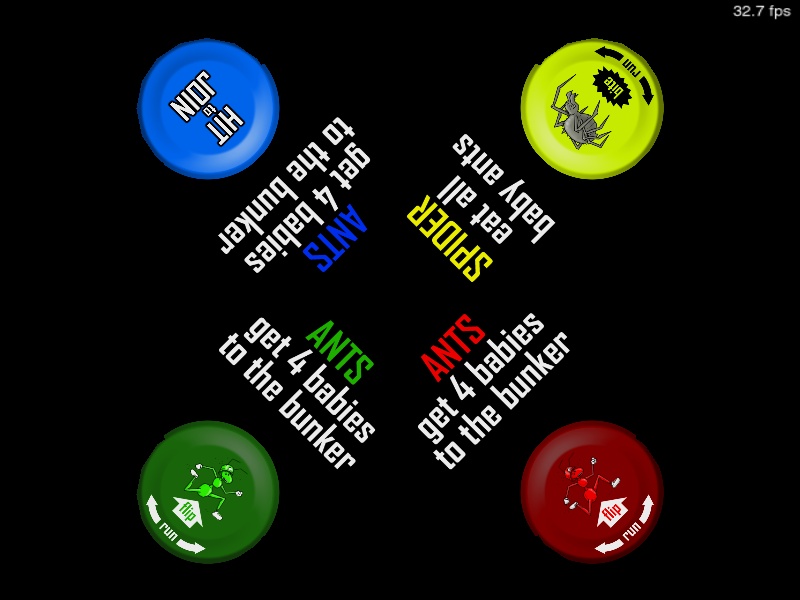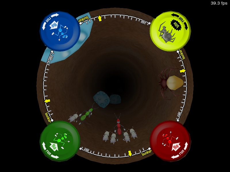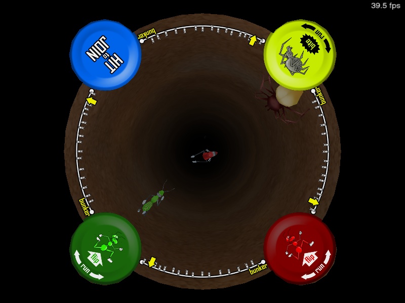 The result was Evac Ants, a tunnel traveling game very loosely based off of the S.T.U.N Runner arcade game. In this game three players are ants who attempt to pick up babies stranded in the tunnel and get them to a bunker at the end. The fourth player is an evil spider chasing the ants. His goal is to eat as many babies as possible. The ants win if they reach the end of the tunnel with collectively at least 4 babies in tow. If the spider wins if he can keep the ants from saving enough babies.