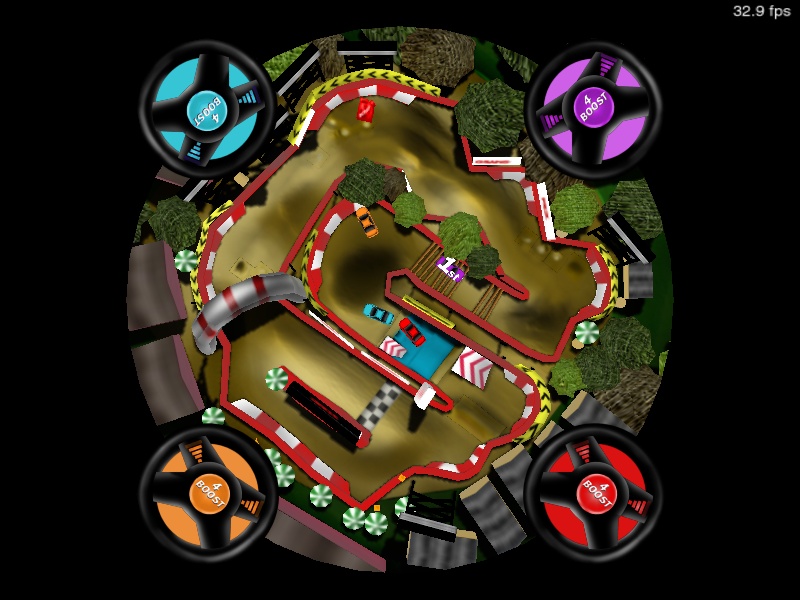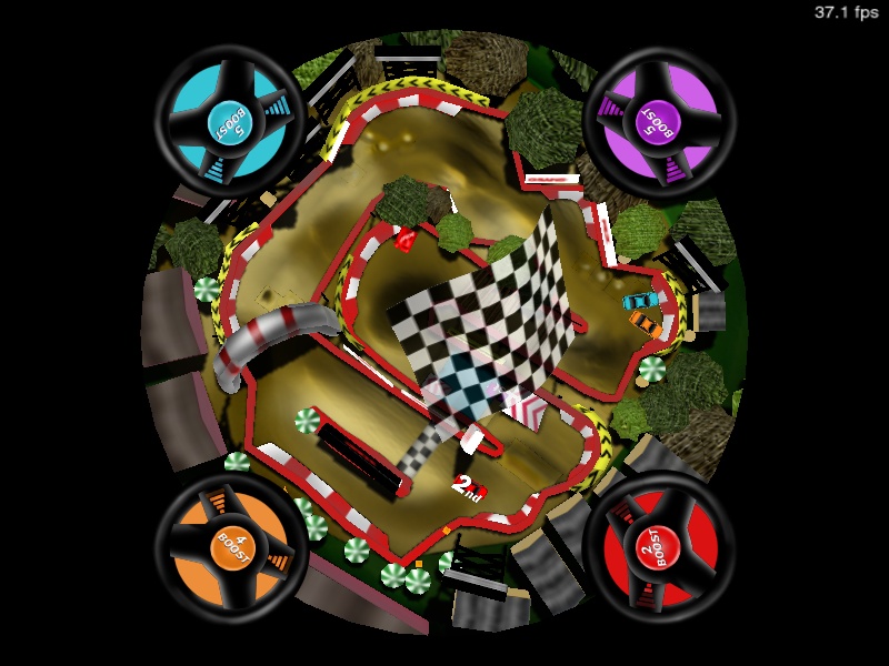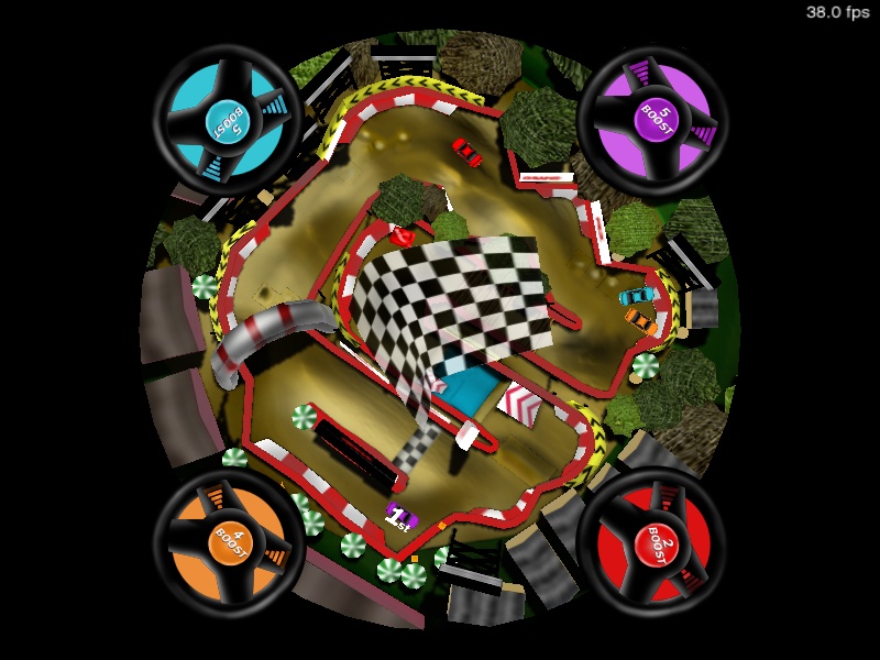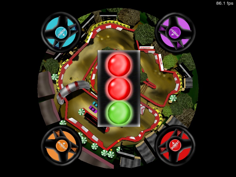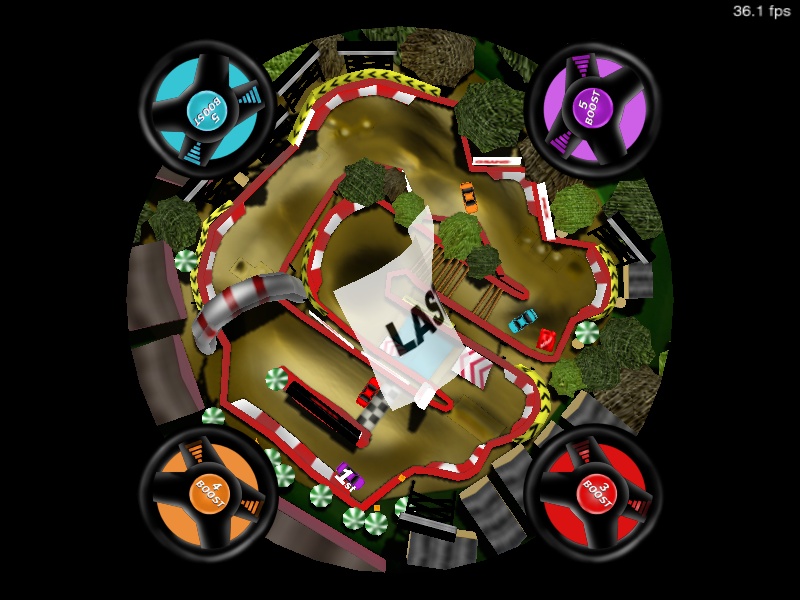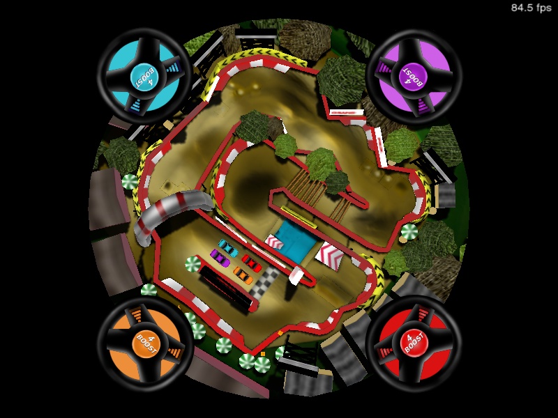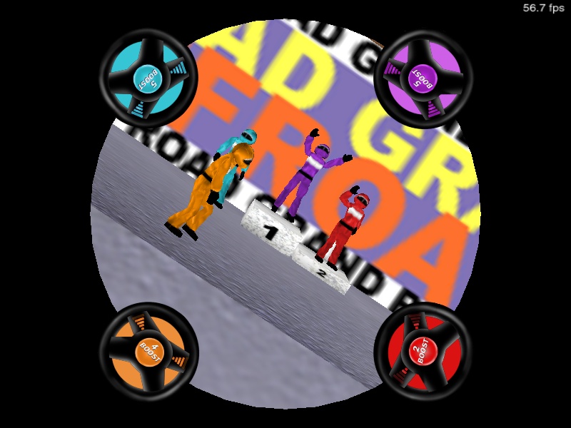 In the past, the assignment for round four has traditionally been "tell a story." However, since people were not only working in VR but also on the Jam-o-drum, with Sony Aibo dogs, and with our in-house robot Quasi, it was expanded to simply "make something entertaining." Back on the Jam-o-drum, I wanted to try to make something that would be fun for people sitting in a bar to do as part of the experience of hanging out in a group. The answer was Off Road Grand Prix, a close remake of the classic Iron Man Stewart's Offroad Challenge arcade game.