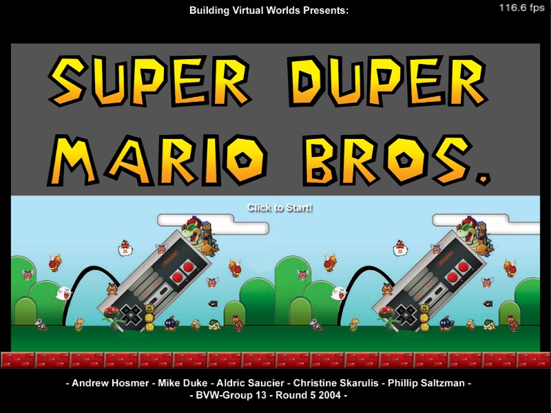 SuperDuperMario.avi (13MB), a screen capture of two people playing the game from the keyboard. This movie requires the xVid codec to play.